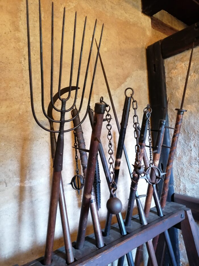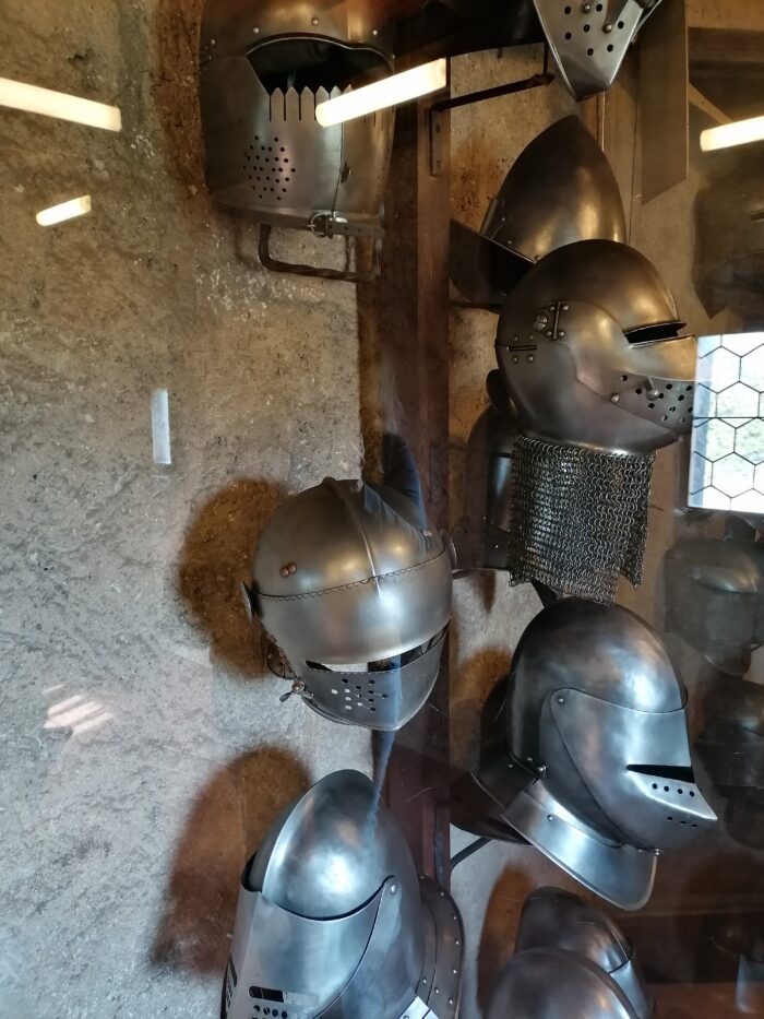 Nad domky ve Zlaté uličce vede ochranná chodba mezi Daliborkou a Bílou věží. Můžete se v rámci prohlídky Hradu podívat a otipovat, jaké rytířské brnění by vám nejlépe slušelo (či vašemu rytíři), osahat si husitské zbraně (au, tím řemdihem to ale muselo bolet!) či okouknout ukázky malovaných štítů a také historických kostýmů. A samozřejmě vykouknout dolů do Jeleního příkopu.