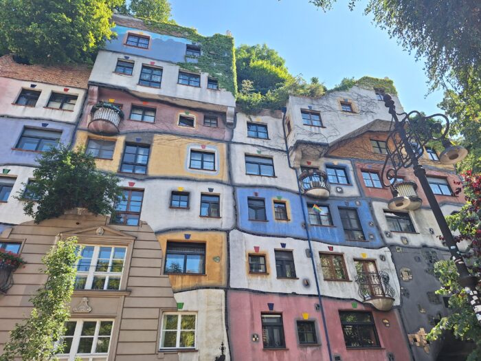 Pan Friedensreich Hundertwasser, původním jménem Stowasser, po sobě zanechal tento přenádherný dům, který podle mého soudu přesně naplňuje onen přídomek Vídně jako města snů, protože vás zcela určitě vezme za hranice reality. Máloco je tam rovné, máloco jednobarevné, občas z toho rostou stromy a rostliny, překvapení číhá na každém rohu (moment – jsou tam vůbec rohy??). Hned naproti je Hundertwasser Village, kterou se většinou snažím stihnout otevřenou, jako že se mi to pokaždé nepovede. Tentokrát jsem ale měla štěstí. Nemá se tam moc fotit, takže si tam zajeďte, pokud si potrpíte na Klimta, Gaudího a podobné styly. Tramvají číslo 1 a vystupte si na Hetzgasse.