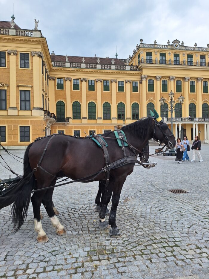 Alžběta Bavorská milovala koně. Také psy – čím větší, tím lepší. Ale vidíte ty dva vrané krasavce úplně vlevo? Jmenovali se Pingo a Pongo, měli velmi sdílného kočího a provezli nás vznešeným krokem po schönbrunnském parku a zahradě. Schönbrunn je inspirován zámkem Versailles a na tamních nádherných záhonech, trávnících a sochách je to hodně znát. Ty můžete ale obdivovat i normálně pěšky, kočáru k tomu netřeba, dokonce ani vstupného. Dovnitř do zámku jsme si ale po zkušenostech raději koupili vstupenku předem na internetu. Tečkovaný bělouš je pro změnu z schönbrunnské zoo. Jak vidím koně, musím ho jít minimálně pozdravit – a to nejsem císařovna!